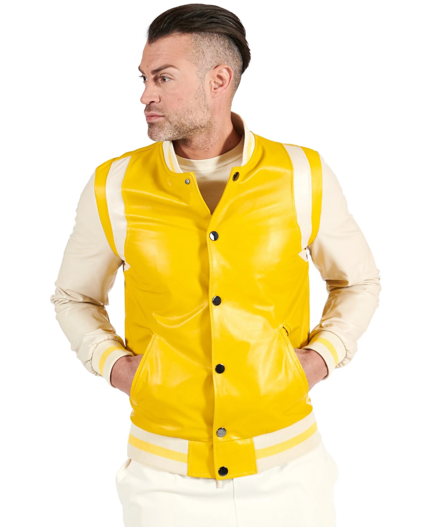 Für diese Saison hat sich D’Arienzo für die zweifarbige Total Leather Varsity entschieden, echtes gelbe Leder mit beige Ledereinsätzen, um Streetwear-Outfits einen Hauch von Grit zu verleihen.