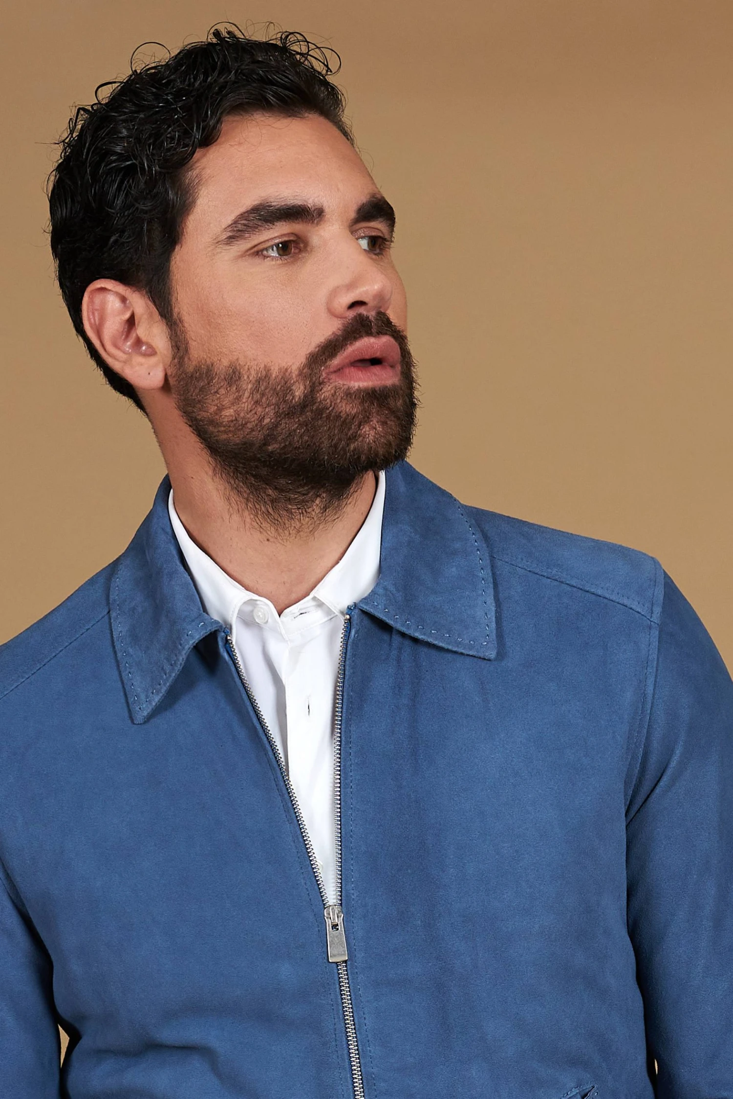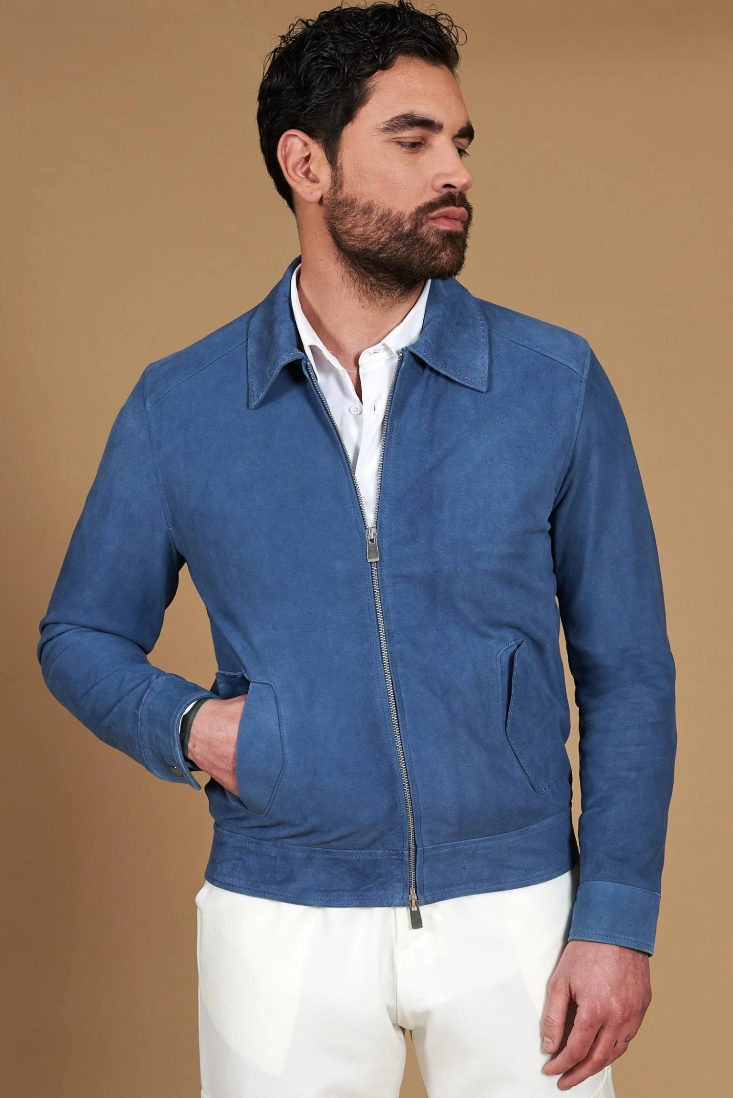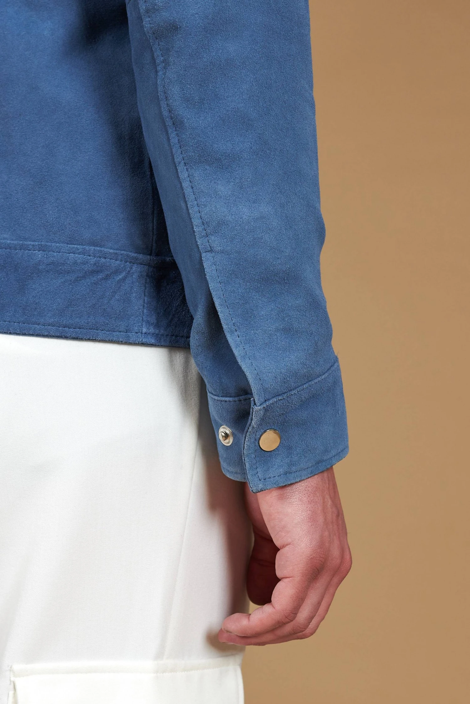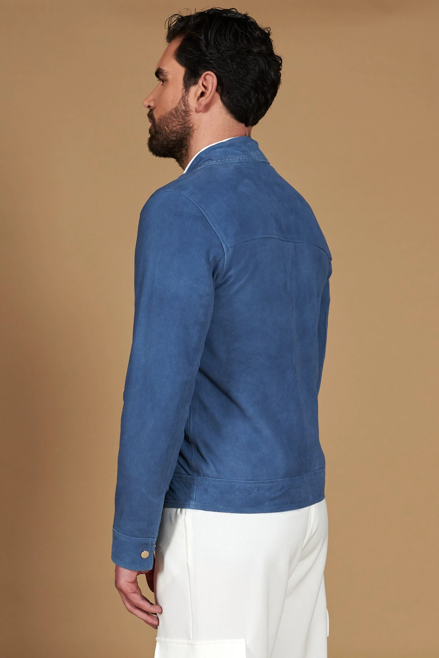 Das Owen-Modell ist die perfekte Verbindung aus modernem Design und Handwerkskunsttradition. Hergestellt aus hochwertigem Wildleder-Ziegenleder, zeichnet sich dieses Stück durch seine glatte Oberfläche und seine unglaublich weiche Textur aus. Der lineare Schnitt sorgt für eine saubere und elegante Ästhetik, während die von Hand gestickten Nähte am Hemdkragen und an den Taschenklappen einen Hauch von Handwerkskunst und Raffinesse verleihen.