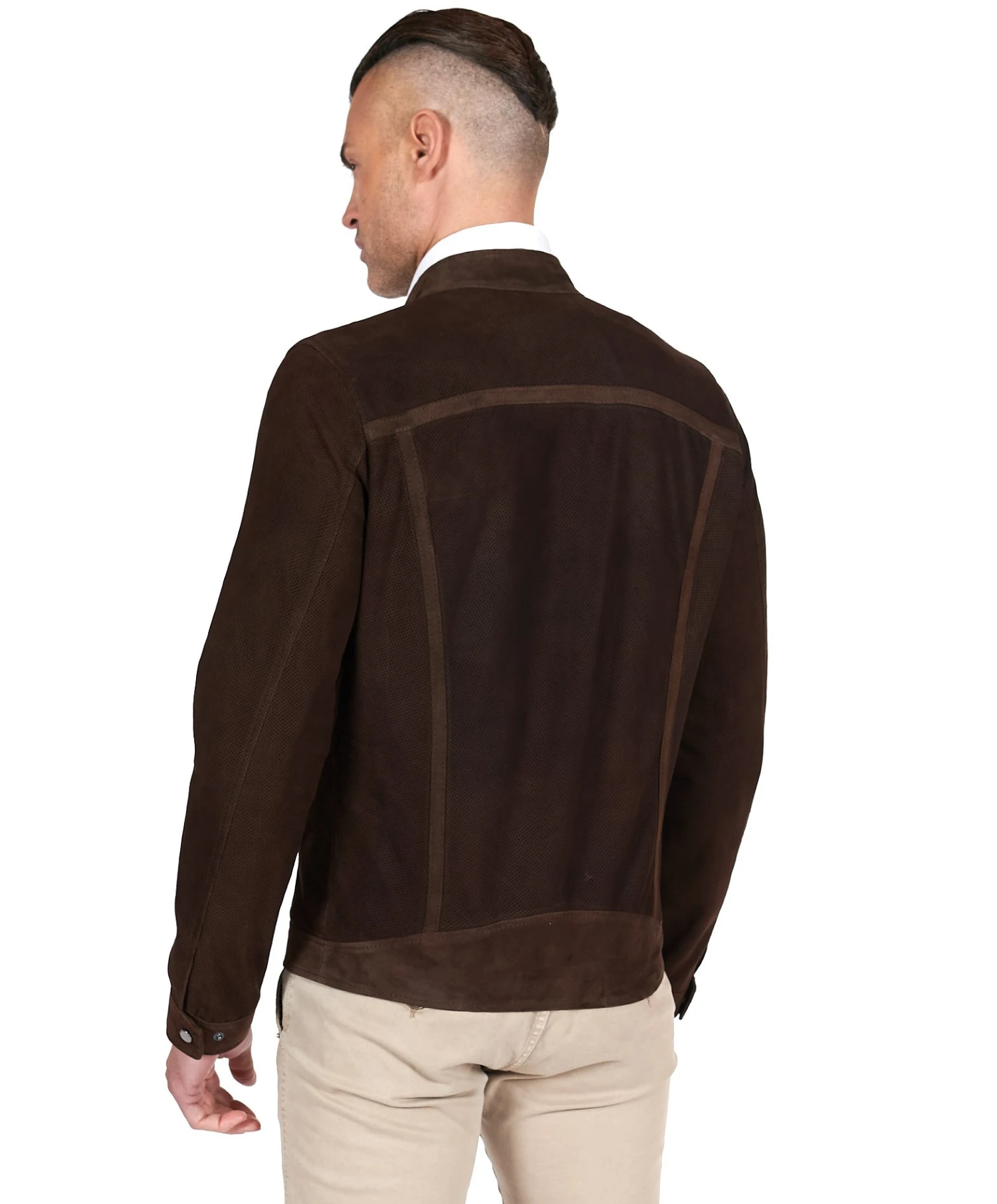 Dunkelbraune Perforierte Lederjacke Koreanischem Kragen