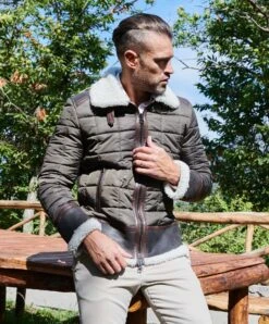 Grün Steppjacke Aus Stoff Und Braunes Schaffell