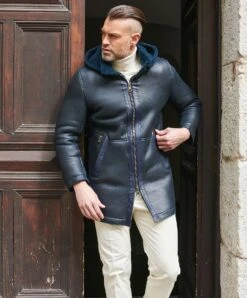 Mantel Aus Blaue Schaffell Mit Abnehmbarer Kapuze