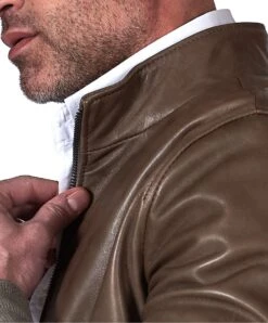 Bomber Cremefarben Lederjacke Mit Kontrastierende Taupefarbene Profile