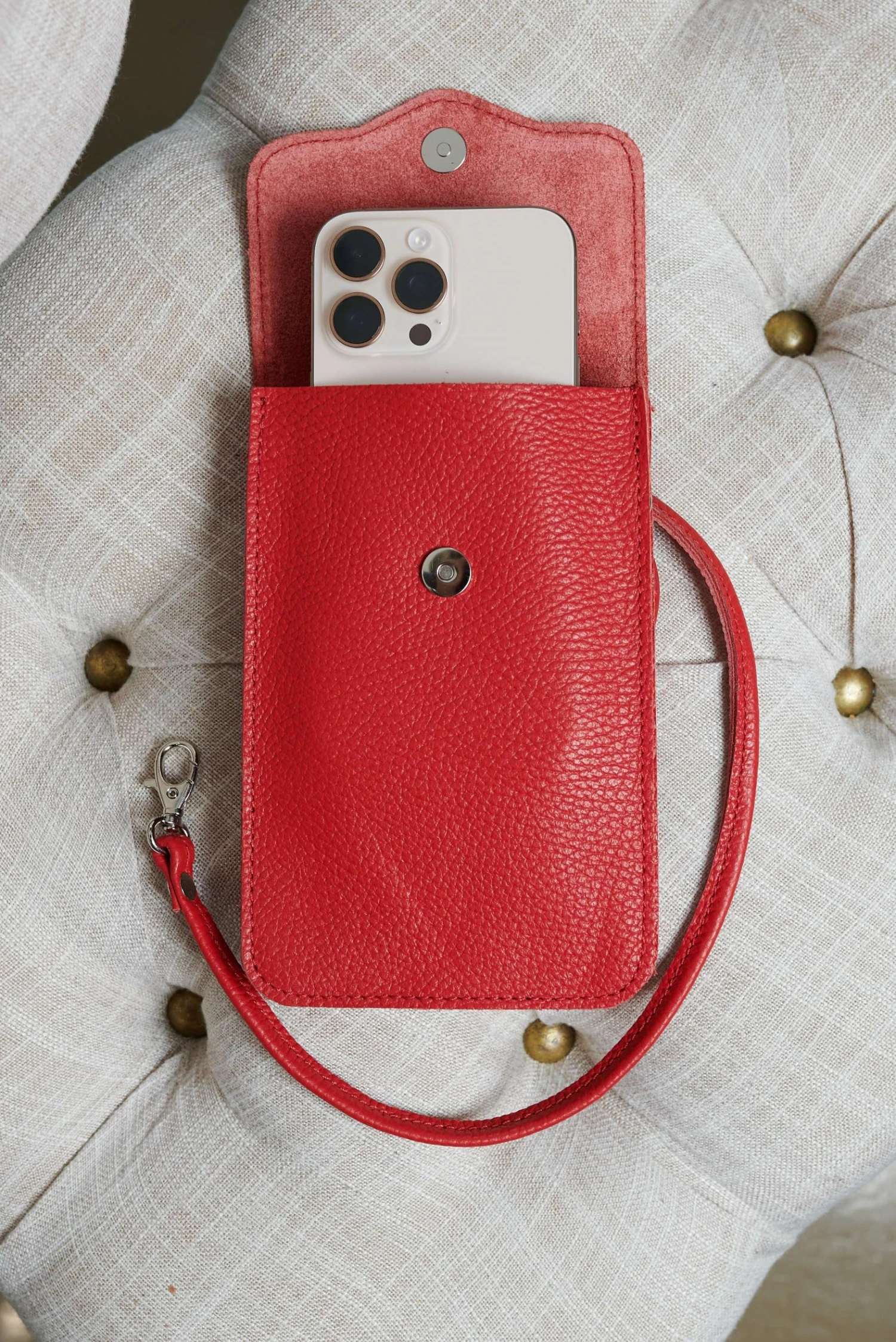 Rote Mobile Umhängetasche Aus Leder Mit Schultergurt